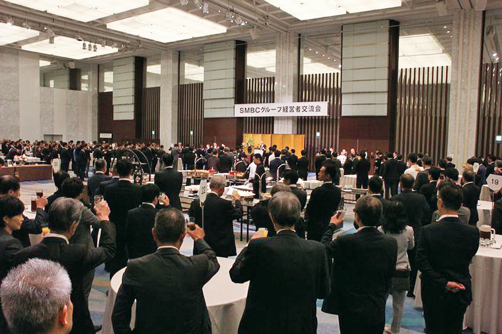 講演後は、会場を移して交流会が開かれる。三井住友銀行の福留頭取による挨拶のあと、参加者同士やSMBCグループ各社の役職員を介しながら、顔を突き合わせての情報交換と懇親が和やかに進められていく。