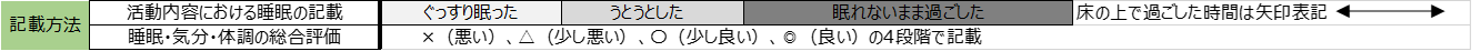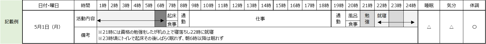 「あなたの睡眠について教えてください」と尋ねた際に具体的に答えられる社員はどれだけいるでしょうか。そう問われると、大まかな睡眠時間や昼寝の有無程度しか思い浮かばない社員も多いかもしれません。睡眠の改善に取り組むには、まず社員自身が「自分の睡眠」をしっかり把握できるよう記録をとることからはじめてもらう必要があります。記録にとることで可視化され、それにより客観的に自分の睡眠パターンを把握することができ、そのパターンに適した睡眠ケアを行うことが可能になります。記録用紙は下図を参考にしてみましょう。