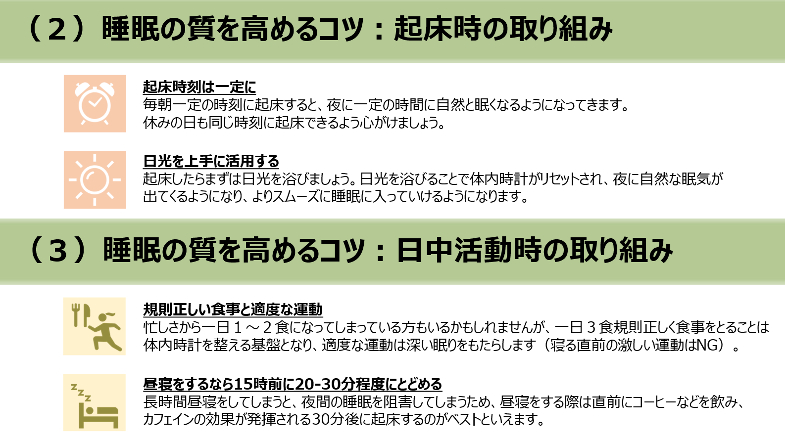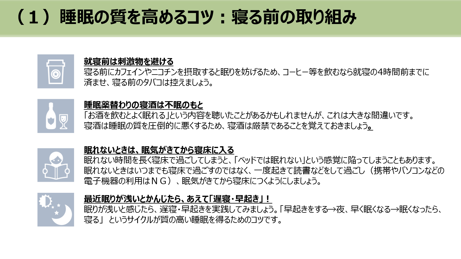 睡眠の質を改善させていくための具体的方法については(1)~(3)の項目を確認し、社員にとって馴染みのない取り組みがあった場合はこれから生活の中に少しずつ取り入れていってもらえるようすすめていきましょう。
