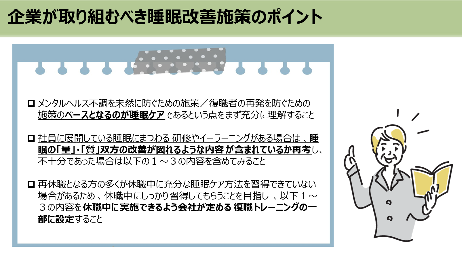 ■メンタルヘルス不調を未然に防ぐのも、復職者の再発を予防するのも、ベースとなるのは睡眠ケア!