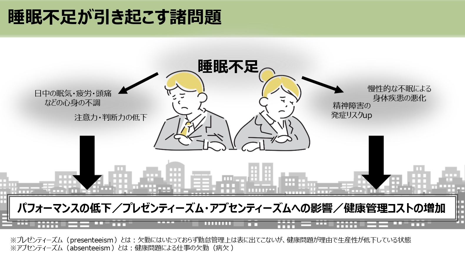睡眠不足は日中の眠気や疲労・頭痛などの不調につながり、私たちの注意力や判断力を低下させ、身体疾患を悪化させたり精神障害の発症リスクを高めたりすることがあります。これらは企業内において、社員のパフォーマンス低下につながっていき、結果的にプレゼンティーズム※やアブセンティーズム※の問題となり健康管理コストをも圧迫させていきます。