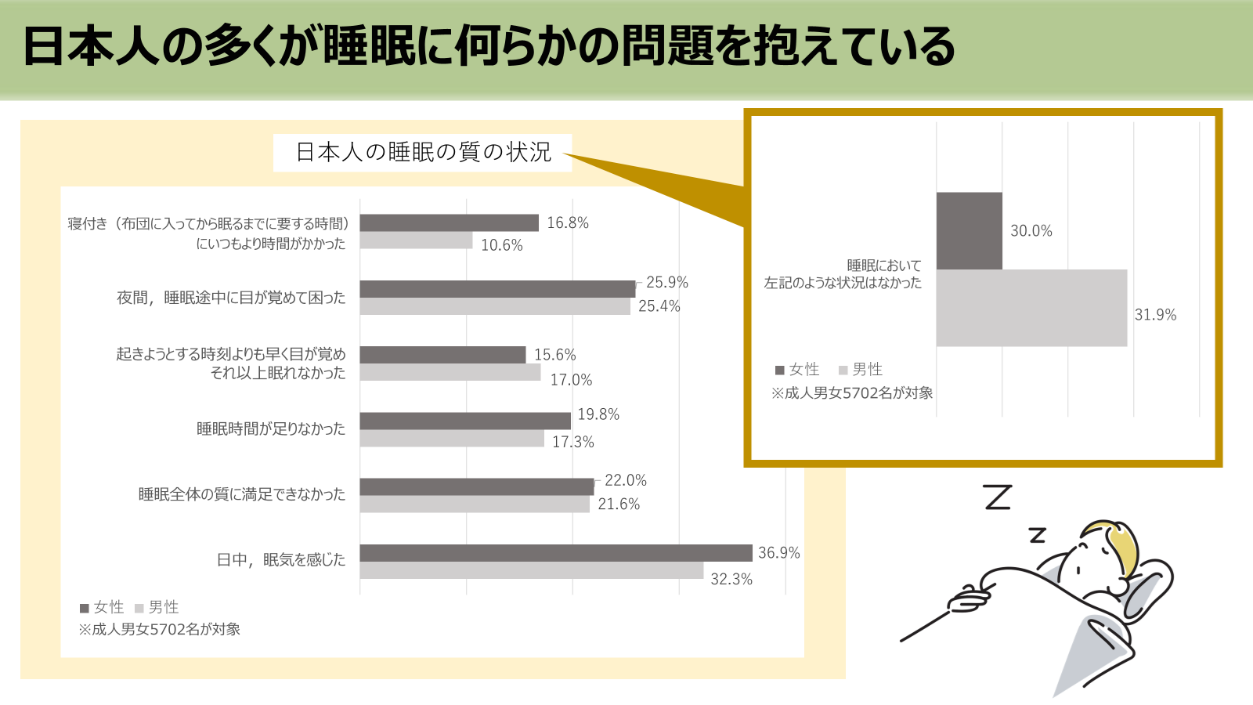 ひとが生きていく上で非常に重要な「睡眠」ですが、残念なことに現代を生きる私たちはまったく睡眠が足りていません。厚生労働省の調査では平均睡眠時間が6時間未満の方は男女ともに約4割もおり、更には睡眠の質に関しても問題を感じていない男女はわずか3割のみであり、大多数は睡眠に多様な問題を抱えていることが明らかになっています。