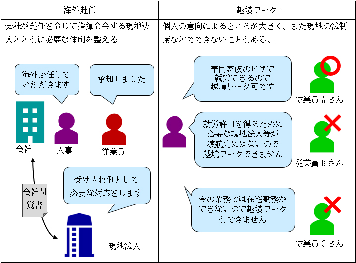 越境ワーカーも海外赴任者と同様に生活の本拠が海外に移りますが、海外赴任者と同等の給与制度とする必要性は低いと考えます。一般的な海外赴任者は会社が異動を命じ、従業員は現地法人の指揮命令下で仕事をするものであることに対して、越境ワーカーは配偶者の海外赴任を契機とするものなど、当事者側の理由によることが多いと考えられ、指揮命令系統も日本勤務時と変わりません。そうした背景を踏まえると赴任者と同等の給与制度にする理由は希薄と言えます。