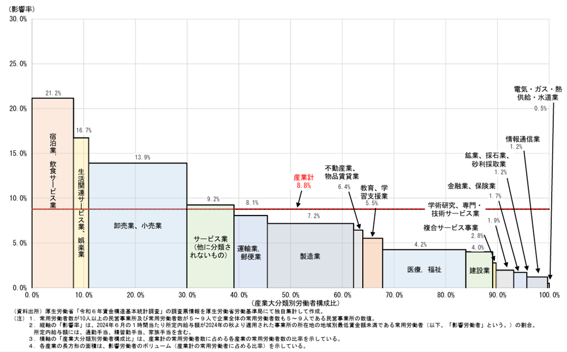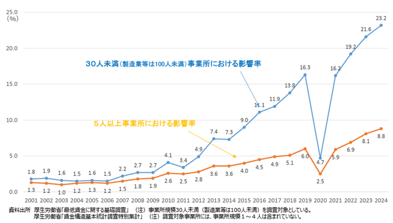 厚生労働省の調査(図表1)をみると、最低賃金改定後に賃金が下回る「影響を受ける労働者」の割合は2014年の3.6%から2024年には8.8%に拡大しました。特に小規模事業所(従業員30人未満、製造業は100人未満)では、2014年に7.3%だったものが2024年には23.2%となり、労働者の約4分の1が対象となっています。