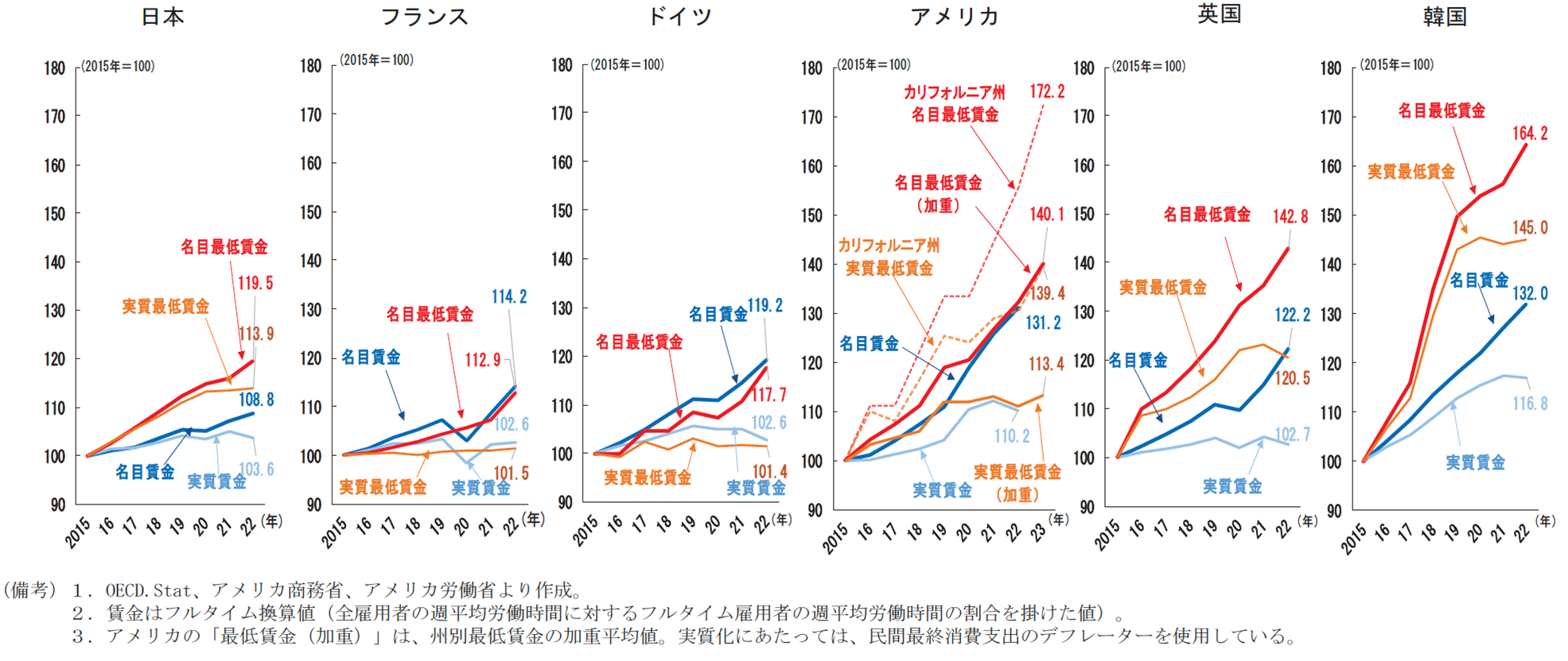 2015年から2022年までの7年間で、日本・フランス・ドイツは名目最低賃金の伸び率が2割未満にとどまりました。これに対し、アメリカ・イギリス・韓国は4割を超える上昇を記録しました。特に韓国では急激な最低賃金の上昇が議論を呼びましたが、労働者の生活改善という面では一定の効果をもたらしています。