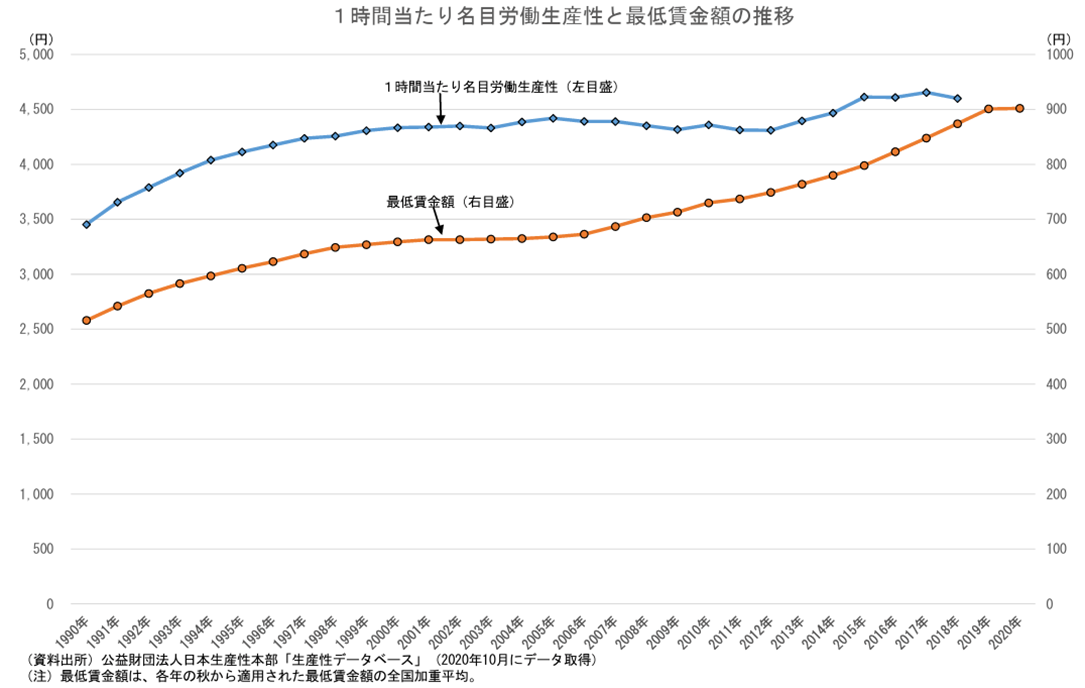 図表3.1時間あたり労働生産性と最低賃金の推移