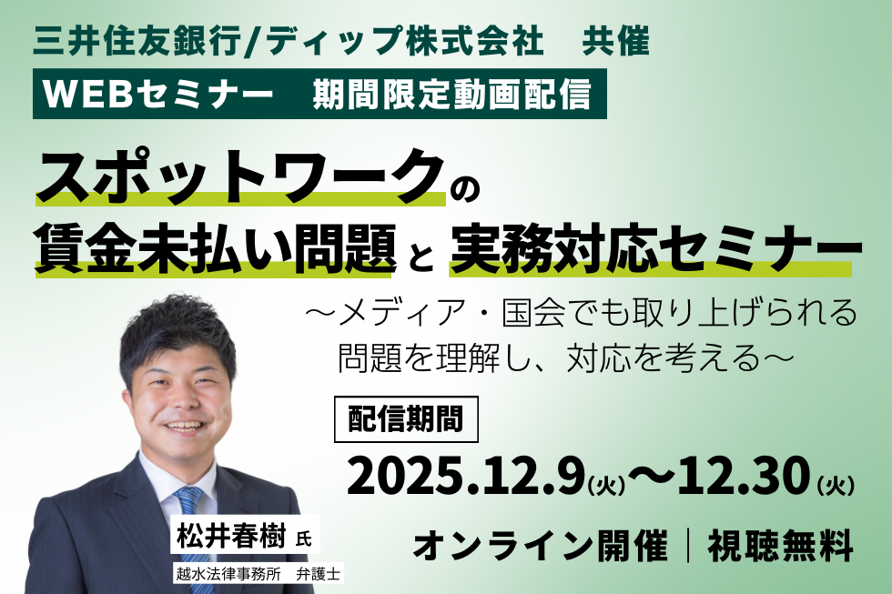 【緊急開催】三井住友銀行 ディップ 共催 WEBセミナー「スポットワークの未払賃金問題と実務対応セミナー ~メディア・国会でも取り上げられる問題を理解し、対応を考える~」