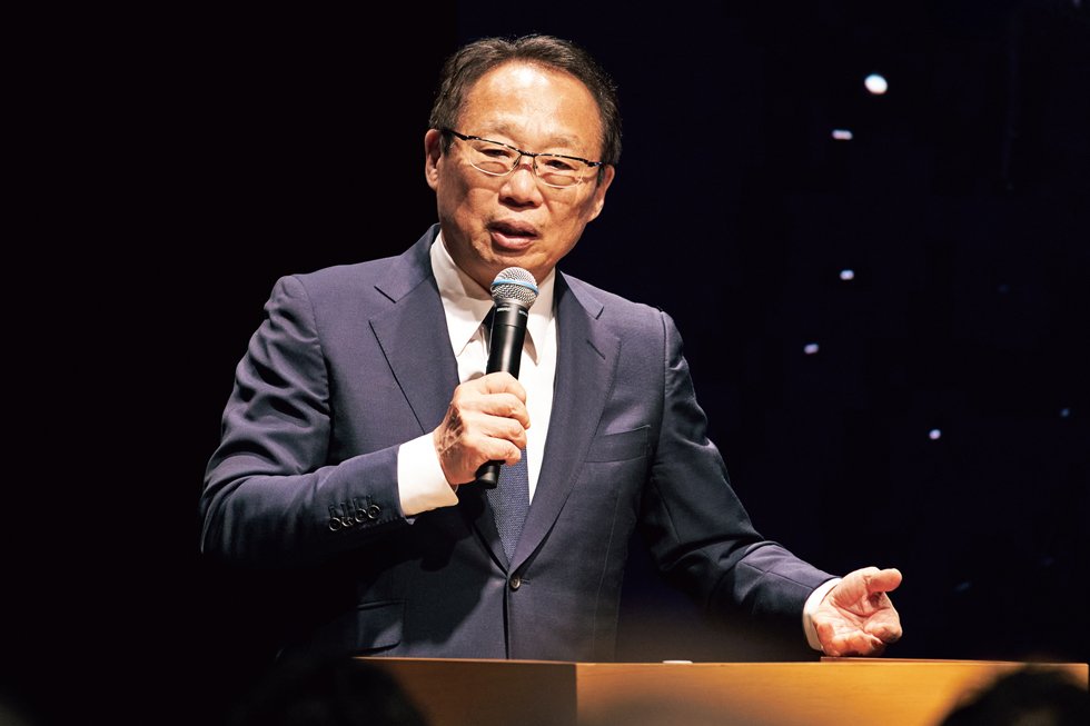 会は講演と対談の2部構成。まずは第1部、スーツ姿で登場した岡田氏は、冒頭から豊かな声量とバイタリティあふれる口調で聴衆を惹き込む。組織をどう動かし、チーム作りをしてきたかとのお題に対して、現在の取り組みを詳細に語った。