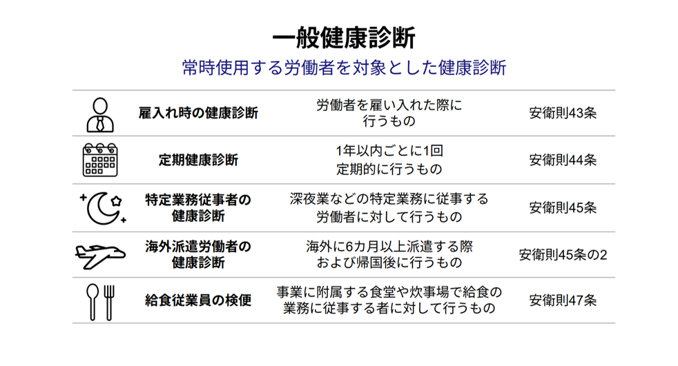 事業者は、受診対象となる労働者に対し、法令で定められた時期に健康診断を実施しなければなりません。これらの健康診断は、常時使用する労働者を対象とする「一般健康診断」と、特定の有害業務に常時従事する労働者を対象とする「一般健康診断以外の健康診断」に分けられます。