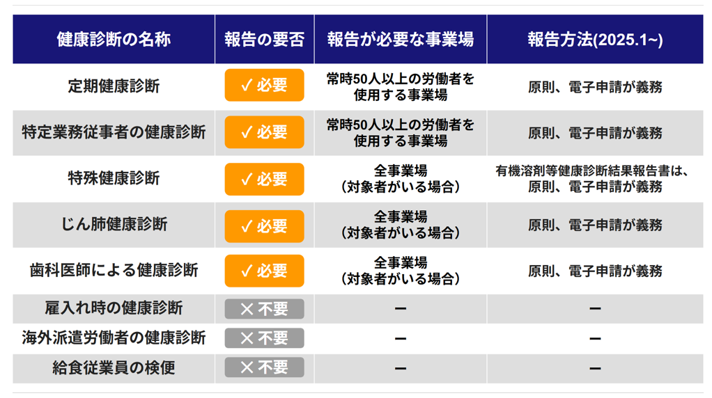 なお、2025年1月以降、一部の健康診断を除き、原則として電子申請による報告が義務化されています。