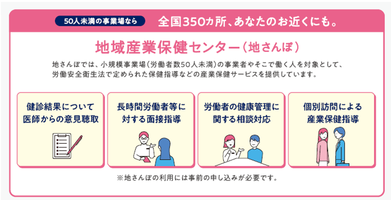 労働者数50人未満の小規模事業場では、産業医の選任義務がないことから、有所見者への意見聴取などの対応を行う医師を確保することが難しい場合があります。このような場合は、地域産業保健センター(通称:地さんぽ)が提供する支援制度を活用することも一案です。