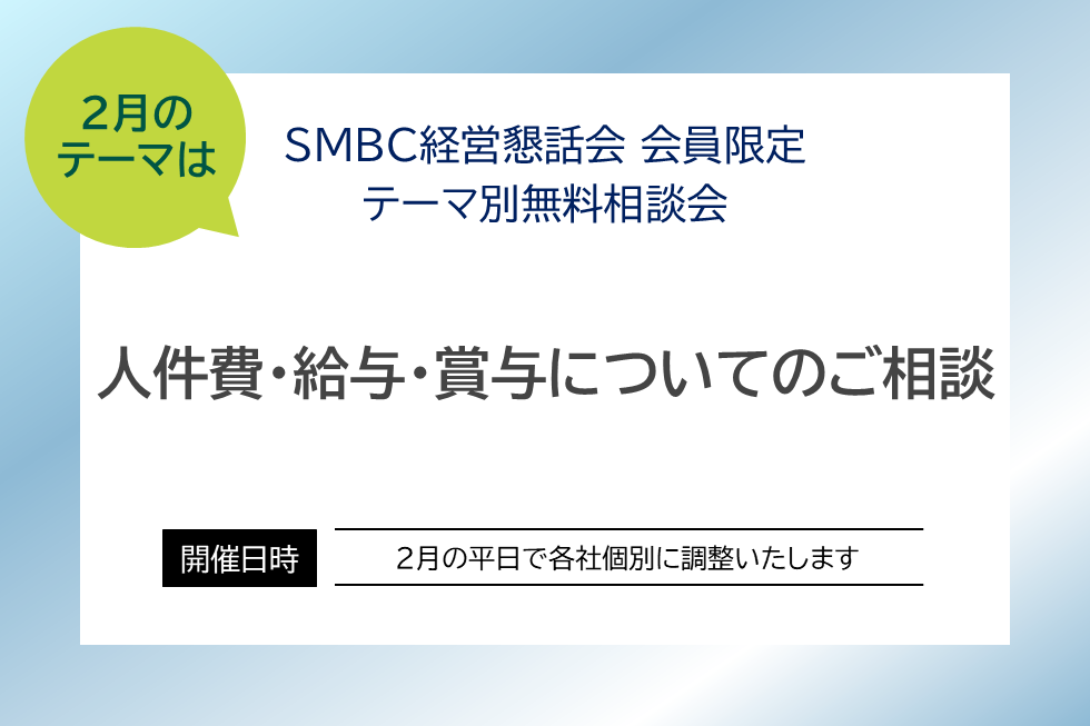 経営実務に携わる方々のさまざまなお悩みに、専門家が個別にお答えします。相談員にSMBC経営懇話会の会員企業の方であれば、どなたでも自社の具体的なお悩みを無料でご相談いただけます。ご来場が難しい方にはWeb相談で対応しております。お気軽にお申し込みください。
