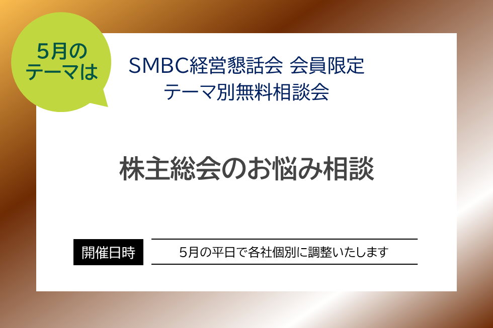 経営実務に携わる方々のさまざまなお悩みに、専門家が個別にお答えします。相談員にSMBC経営懇話会の会員企業の方であれば、どなたでも自社の具体的なお悩みを無料でご相談いただけます。ご来場が難しい方にはWeb相談で対応しております。お気軽にお申し込みください。